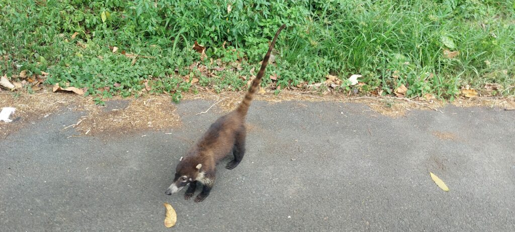 På vej tilbage til bilen så vi et træ fyldt med næsebjørne. Der var omtrent ti, som klatrede rundt i toppen af træet. De kom pænt ned til os så vi kunne tage nogle billeder. Derefter kørte vi op på øverste parkeringsplads, hvor man kunne tage endnu et billede af vulkanen. Det var hurtigt overstået, så vi ville køre til den anden del af parken. Her var vejen dog så ufremkommelig at vi valgte at springe det over. Til gengæld kom der næsebjørne ud på vejen til os. De er åbenbart over det hele, og disse virkede vant til mennesker, og så ud til at søge føde ved bilerne.