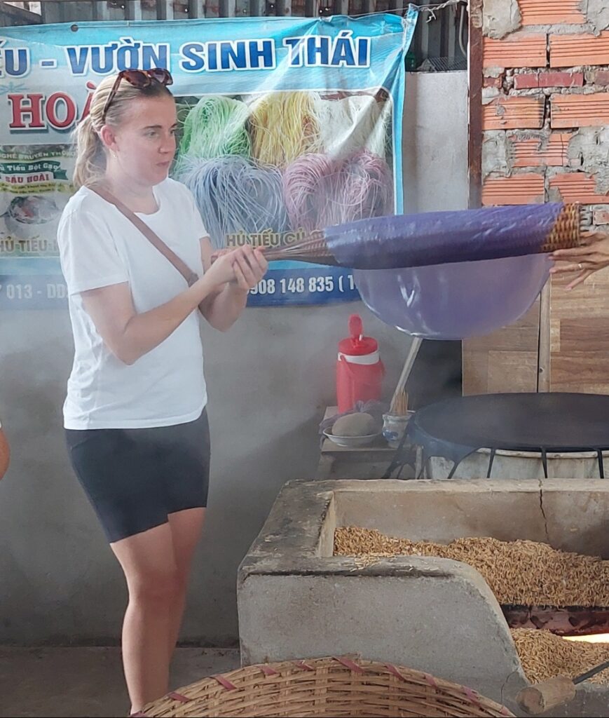 Vandstanden var nu blevet for lav til at kunne sejle helt op til nudelfabrikken, så vi måtte lægge til ude i den store flod, og gå de 300 meter. Der var spændende vietnamesiske hatte og vifter, som drengene købte en af hver. Tina lavede en rispapirspandekage, og drengene skulle gribe en sådan, som blev skåret i lange strimler.