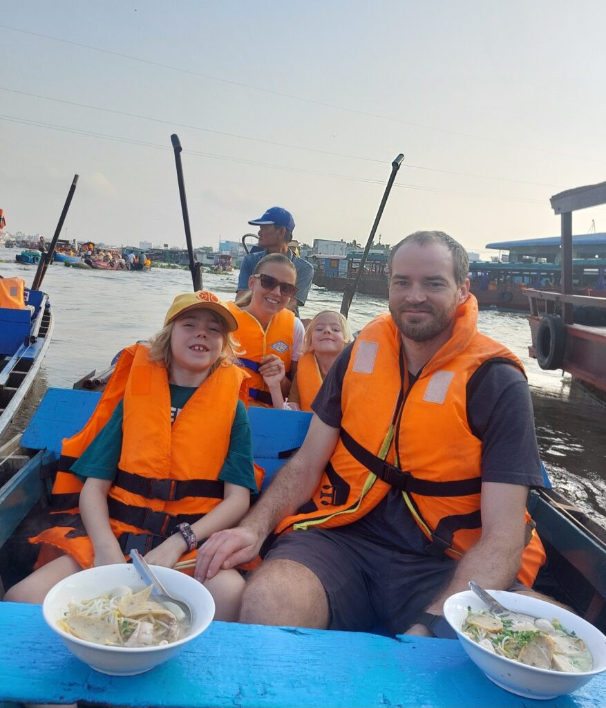 Op før fem, og af sted! Vi troede vi blev hentet i en bil, men det var en båd, der ventede på os i stedet. Vi sejlede af sted i mørket mod det lille, lokale flydende marked, hvor vi købte lidt bananchips og andet? Herefter skulle vi hente til en risnudelfabrik, da det var højvande, så der var vand nok i floden. Desværre holdt der en pram med en gravko og spærrede vejen, så vi måtte sejle hen og spise morgenmad. Nudelsuppe, lavet i en båd, med friskpresset juice og iskaffe lavet i en anden båd. Vi sad selvfølgelig i vores egen båd og spiste.