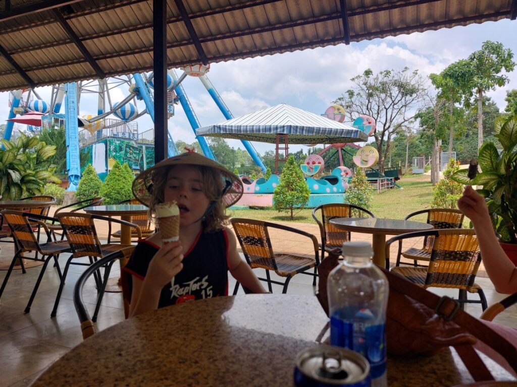 Ovenfor vandfaldet stod et flot pariserhjul, som drengene havde glædet sig til at prøve, men desværre kørte det ikke. Der var andre, noget mere faldefærdige, forlystelser, som også var slukkede, og vandlandet uden vand var også ret spooky. Vi legede lidt på legepladsen og spiste is, inden vi gik ind i 7d-biografen. De havde vist glemt at tænde for nogle af dimensionerne, og Jeppe syntes at filmen var alt for kort, men de nød det vist alligevel. Imponerende teknologi, i hvert fald hvis vi havde været omkring årtusindskiftet. Udenfor biografen var et lille legeland og en masse slukkede spilleautomater. Drengene nød legelandet, mens Tina og Mads nød en øl i solen.