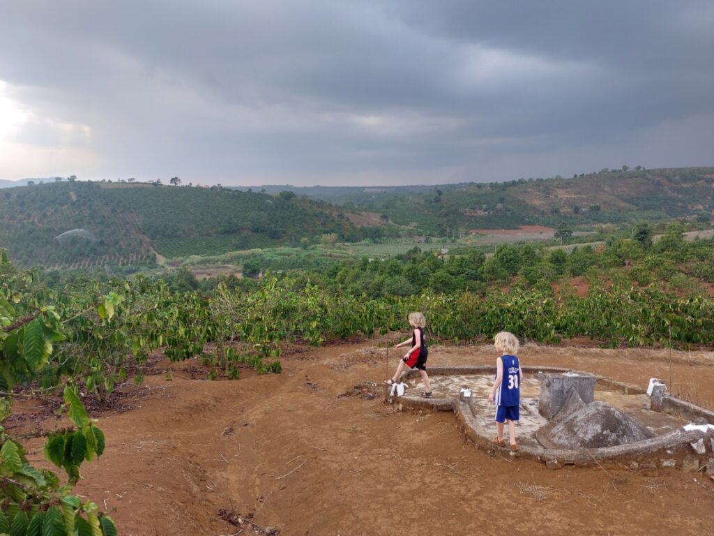 Så kørte vi af sted mod en kaffeplantage, men da klokken var blevet mange, besluttede guiden at udskyde det til dagen efter. Så var vi alligevel tæt på plantagen, så vi kunne lige smutte forbi alligevel. Så begyndte det at styrtregne, så plantagen blev udskudt igen. Regnskyllet stoppede, og i tog alligevel ud at kigge på kaffe. Drengene kom vidt omkring, og fandt et fundament af et gammelt hus, indtil vi så lyn, og besluttede at komme op i bilen igen.