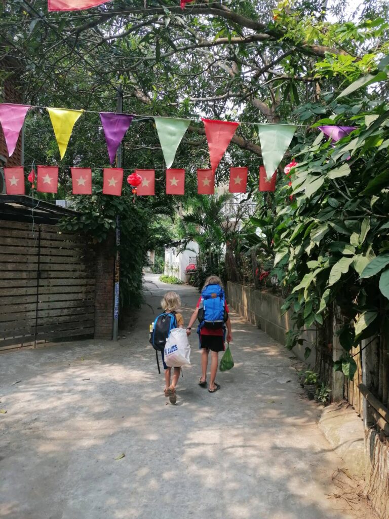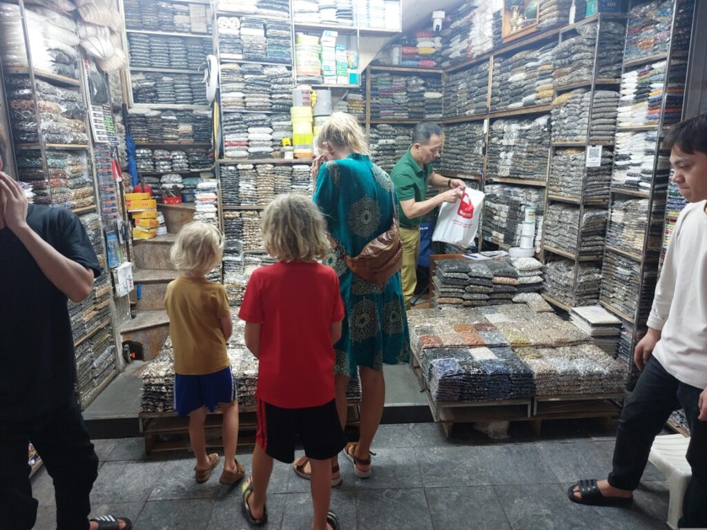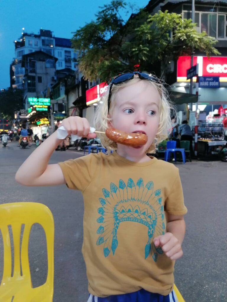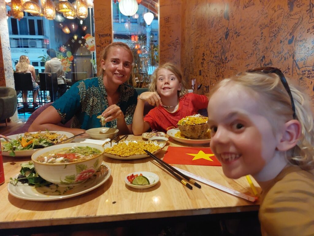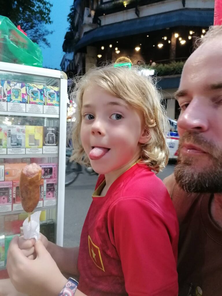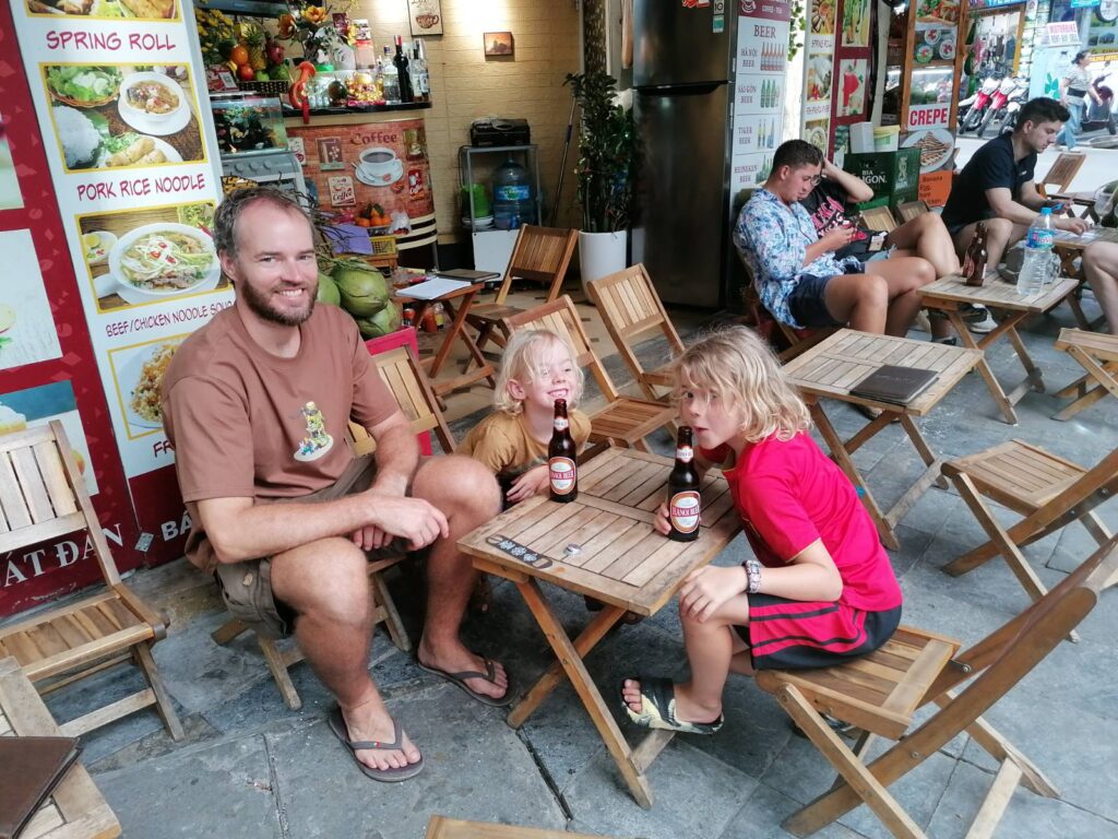 Naboen til den anden side havde træstole og Carlsberg, så der skulle vi ikke ond, men Tina så at de lavede nogle rigtig flotte bao, så det må vi på jagt efter. Dog ikke i dag, hvor vi fandt et sted hvor Jeppe kunne få en halv kokosnød med rejer, Tina en vietnameserpandekage uden kød og Mads en seafood-suppe. De havde desværre ikke pasta, så Johan måtte nøjes med en spaghetti “carbora”. Drengene spiste ikke meget, så efter endt måltid fandt vi en pandekage til Johan på vej hjem mod hotellet. Den blev der heller ikke spist meget af.