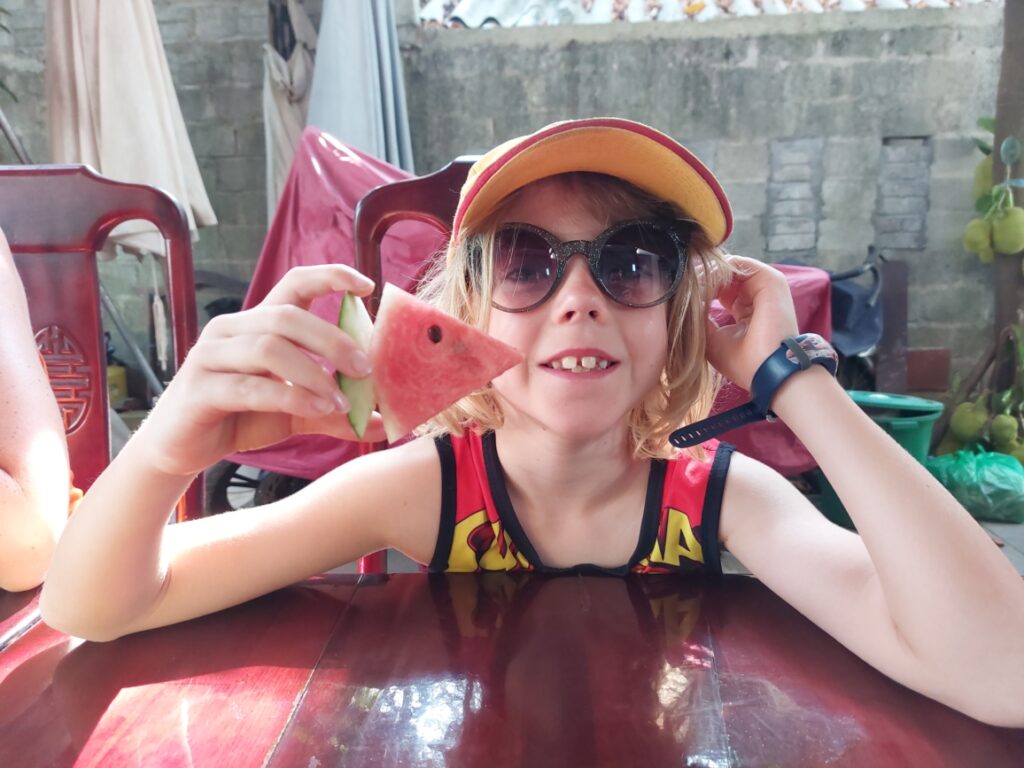 Igen en dag hvor børnene vågner lidt for tidligt. Fin morgenmad på hoteller, hvor Jeppe især var glad for vandmelon skåret ud som fisk. Dernæst i poolen i nogle timer, indtil Tina fik hotelfolket til at levere pizza ved poolen. Vi satte os dog op til morgenmadsbordet og spiste dem.