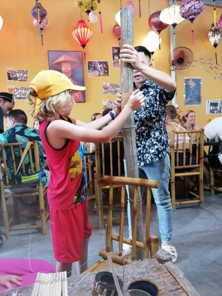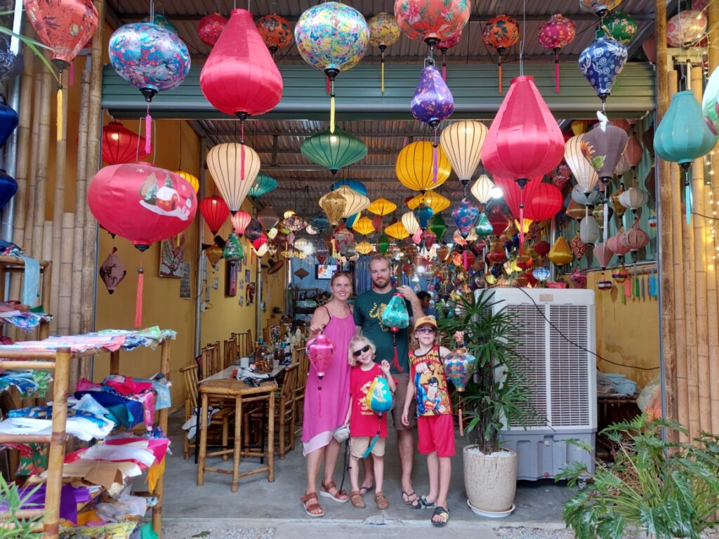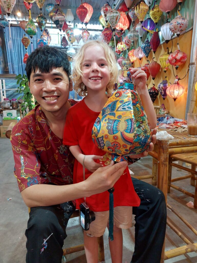 Efter maden gik vi ind til byen, og fandt ud af at der var mange hyggelige steder omkring markedet. Vi anskaffede os nogle lychees, som drengene godt kunne lide. Vi var egentlig på vej op til et lanternelavningskursus efter en is, men Mads ville lige over at høre hvad et skræddersy jakkesæt kostede. Et kvarter senere havde de målt op, fundet stoffer og givet drengene vand (alle hernede elsker dem), inden vi kunne få første udkast på en pris. Vi blev ødt til at skynde os lidt for at nå op til workshoppen.