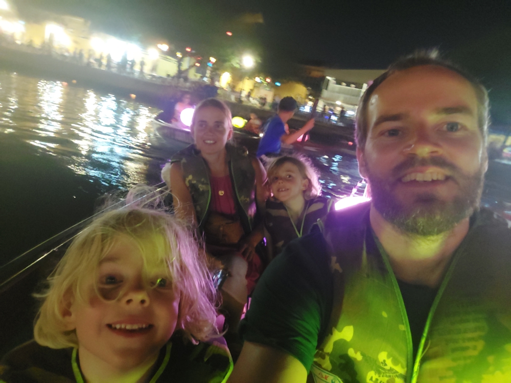 Drengene ville gerne med en båd, så det skulle vi selvfølgelig. Det var en flot tur, med masser af fine små både med lanterner på. Vi havde ikke behov for at sætte mere affald i floden, selv om der virkelig var mange, der ville sælge os en papdims med et lys i. Da vi var kommet nærmest hjem spurgte vi “kaptajnen” om vi kunne blive sat af, så vi ikke skulle gå så langt hjem, da klokken igen var blevet mange. Det kunne vi fint, og så tulrede vi igennem det sidste stykke marked, købte en drikkevare og gik hjem i seng.